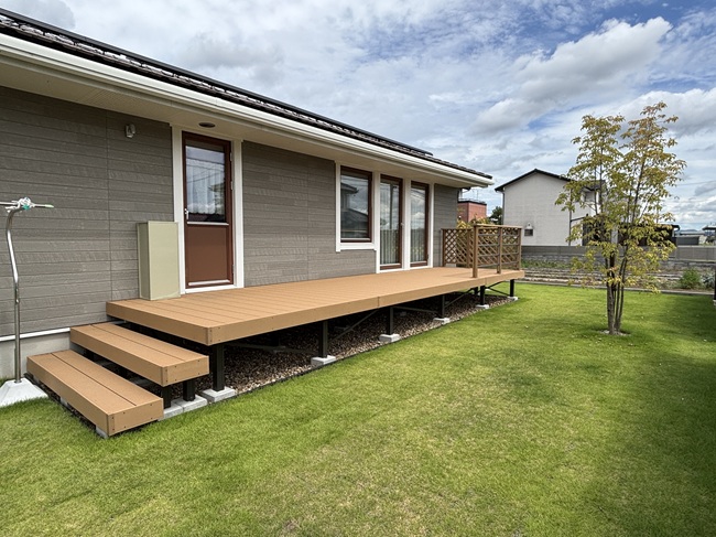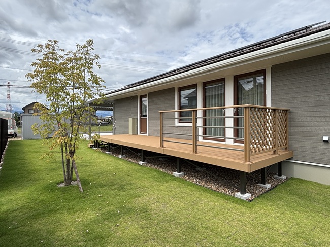 お庭に大きなデッキを備えており、そこでゆっくりとコーヒーを飲みながら自然を感じる時間を楽しめます。天然芝が一面に広がる庭で、四季折々の変化を間近に感じられます。