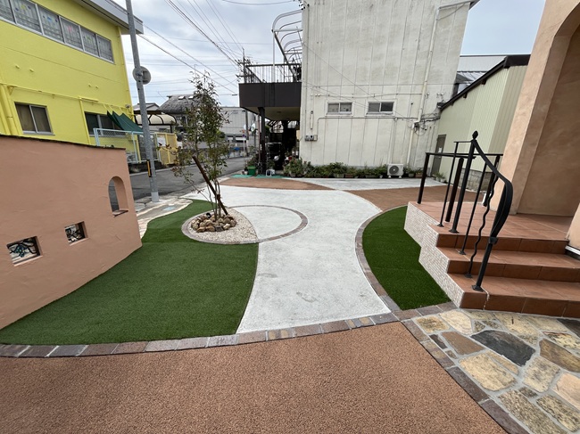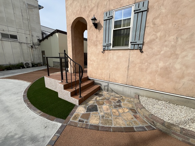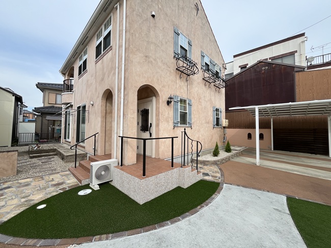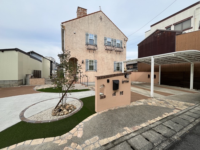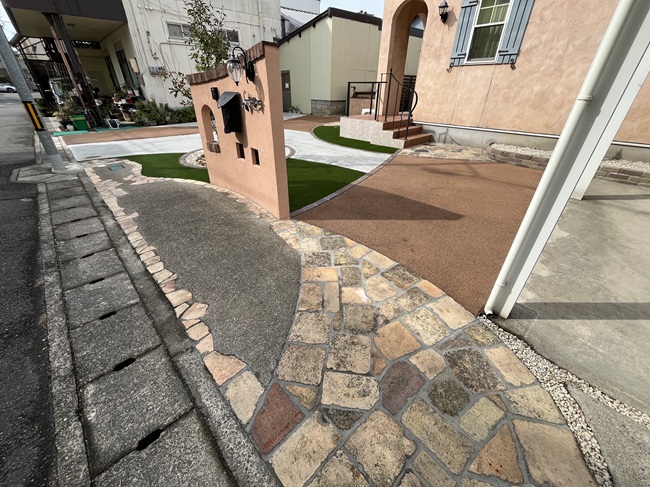 外構のリフォーム事例をご紹介します。駐車場・アプローチのリフォームを行い、既存の素材を最大限に活かしてデザインしました。また、門袖・塀は建物と統一感を出す為、同系色で塗り替えました。駐車スペースはコンクリートと透水性コンクリート(ベージュ色)で優しい印象になっています。既設の乱形石を再利用したことで、アンティーク調の風合いがでて素敵に仕上がりました。