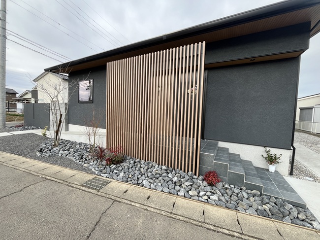 スタイリッシュな外構が訪れる人々の目を引きます。玄関周りには、建物のデザインと調和する採光・目隠し機能を持つスクリーンを設置。また、タイル貼りの門袖が重厚感を演出。デザイン性と機能性を兼ね備え、訪れる方に高級感を感じさせます。植栽やライトアップにより、さらに上質な仕上がりを実現しました。さらに、プライバシーを重視した外構設計も特徴の一つです。お庭部分には、建物と同色の袖壁を設けることで、外部からの視線を遮り、リラックスできる空間を提供。デッキには縦格子の仕切りを取り入れ、愛猫ちゃんが安心して遊べるスペースを確保しています。ライフスタイルに合ったアウトドアリビングが実現されています。